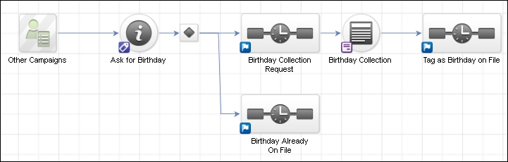 We need to be logged in to Infusionsoft, inside a specific account and in a new campaign. In addition to this, we also want to have a functional tag created to trigger the birthday collection and another tag to track people with a birthday on file.