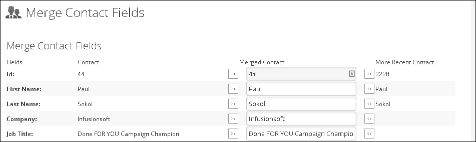 The center column consists of the data that will be merged into the resulting contact record. We can click on the arrows either side of this column to move data: