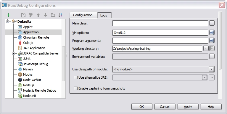To create the default setup, expand the Defaults node, select the desired runtime type and fill out the form towards the right hand side of the on-screen window. For example, if you select the Default/Application configuration, you can edit Java VM options or environment variables that IntelliJ IDEA will then duplicate to every new profile, as shown in the following screenshot: