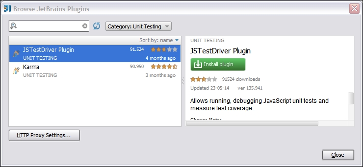 If you skipped the installation of these plugins when you set up the IDE, click on Install Jetbrains plugin, select Unit Testing from the Category drop-down menu, and install them as shown in the following screenshot: