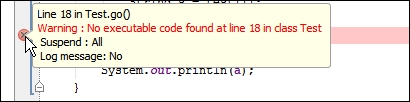 Otherwise, if the breakpoint is invalid, the IDE will mark it with the invalid breakpoint icon and thus ignore it. The breakpoint can be invalid because it is placed on the line with the comment or in a block with an opening or closing brace, for example, as shown here: