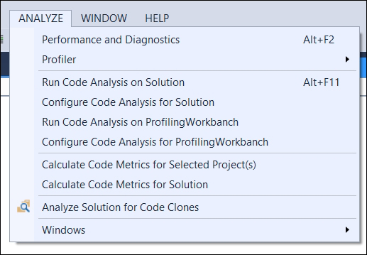 The main menu root is ANALYZE. Here, we find all we need to understand an application's performance details, together with interesting static analysis tools to verify a programmer's skill.