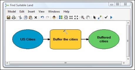 With these tools, you can build sophisticated models by using ModelBuilder or Python, and then publish them to ArcGIS Server. For example, to perform a buffer, as we did in Chapter 5, Geometry and Symbology, with the GeometryEngine tool, you would drag the Buffer tool onto the ModelBuilder canvas, as shown here, and specify its inputs and outputs: