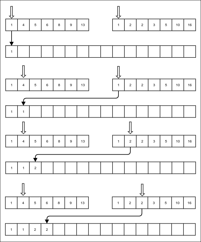 In the previous section, we tried to divide the array in such a way that when we sort each part, the entire array is sorted. We faced the problem that when we try to do that, the two parts are not equal in size causing the algorithm to sometimes take a quadratic amount of time. What if, instead of trying to divide the array in a way that sorting the parts would sort the whole, we just divide the array into two equal halves? Of course then, sorting the parts will not sort the entire array. However, if we have two array parts sorted on their own, can we merge them together to produce a sorted array as a whole? If we can do this efficiently enough, we would have an algorithm guaranteed to be efficient. As it turns out, it is possible. But we need to think about where the merged array will be stored. Since the values are being copied from the source array, the result needs to be stored in a separate place. So, we will need another storage of equal size for mergesort.
