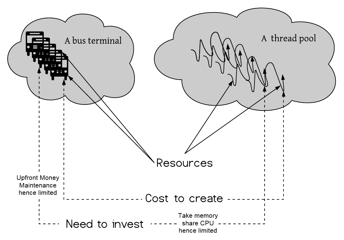 What are thread pools? Why do we need these? Let's take a real-life example, consider a bus terminal that has a certain number of buses in the pool. The buses are added once to the pool and then are reused as required to serve various routes.