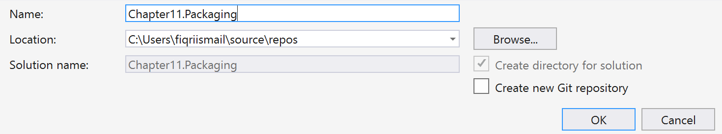 3. In the Name: textbox, type  Chapter11.Packaging as the name of the solution, as shown in the screenshot. Select a preferred location under the Location: drop-down list, or click the Browse... button and select a location. Leave the defaults as they are: