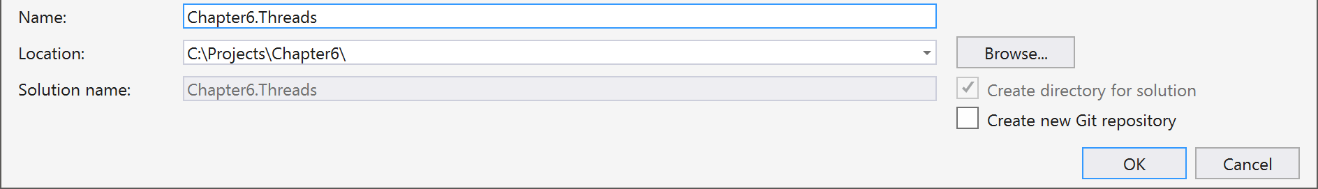 1. In the Name: textbox, type Chapter6.Threads and, in the Location: textbox, select a path from the drop-down box or click on the Browse... button to locate a path: