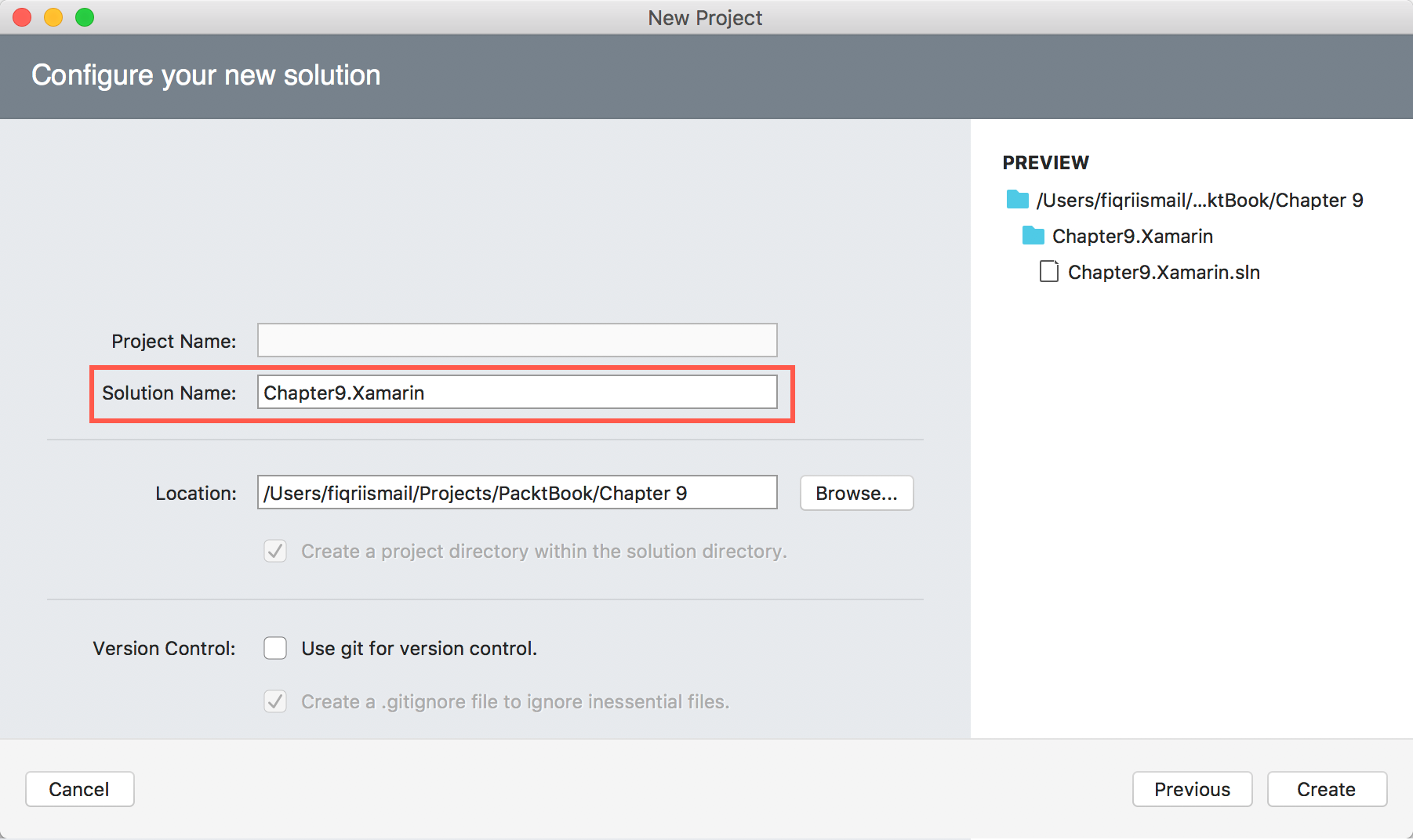 1. In the Solution Name: textbox, type Chapter9.Xamarin. Also make sure you have selected a proper location: