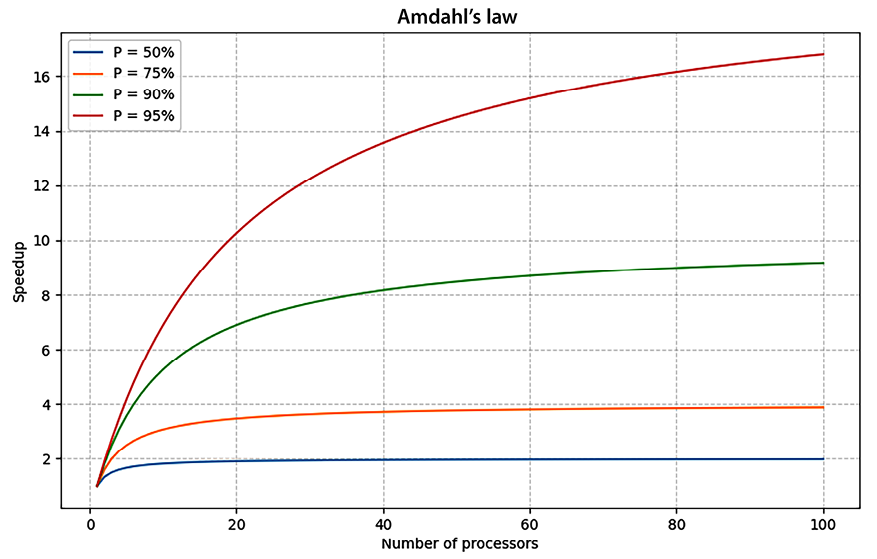 The first is Amdahl’s law (see Figure 13.5). It states that if we want to speed up our program by throwing more cores at it, then the part of our code that must remain sequential (cannot be parallelized) will limit our scalability. For instance, if 90% of your code is parallelizable, then even with infinite cores, you can still get only up to a 10x speedup. Even if we cut down the time to execute that 90% to zero, the 10% of the code will always remain there.