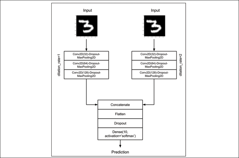 Listing 2.1.2 for cnn-y-network-2.1.2.py shows the implementation of the Y-Network using the Functional API. The two branches are created by the two for loops. Both branches expect the same input shape. The two for loops will create two 3-layer stacks of Conv2D-Dropout-MaxPooling2D. While we used the concatenate layer to combine the outputs of the left and right branches, we could also utilize the other merge functions of tf.keras, such as add, dot, and multiply. The choice of the merge function is not purely arbitrary but must be based on a sound model design decision.