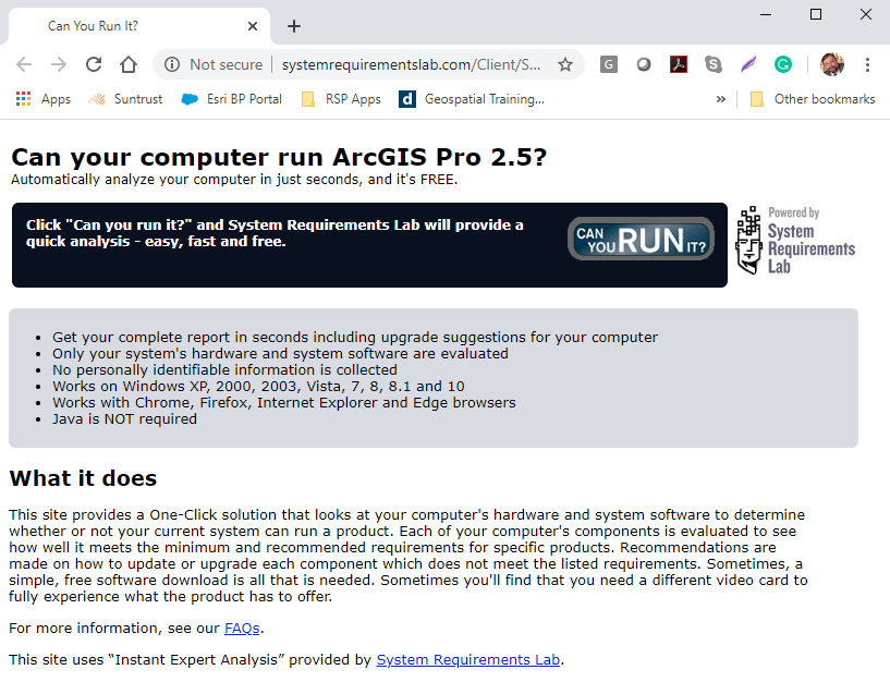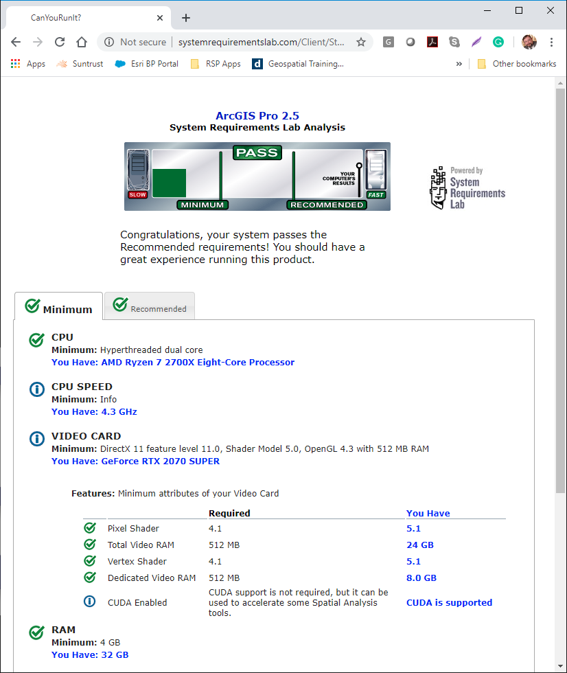 This will tell you whether your computer has the required horsepower to run ArcGIS Pro. If your system fails to meet any of the minimum requirements, you will be able to see where your system falls short.