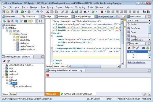 In this section, the database table created and modified in the previous sections will be queried, and the result is displayed in a HTML table. Create a JSP, catalogQuery.jsp. Select the JSTL Core 1.1 and JSTL SQL 1.1 tag libraries for the JSP. As in the previous sections, add a setDataSource tag for obtaining a connection with the Oracle database. The SQL taglib tag to query a database is sql:query. Position the cursor in the JSP page, and select Query tag in the SQL Component Palette.