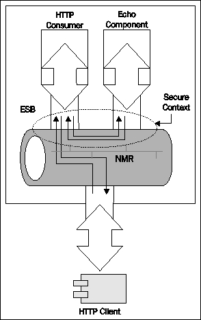 The security sample use case will have servicemix-http configured in the consumer role, listening for HTTP transport for a particular port. We then configure an Echo service component as the targetService for the above HTTP consumer. When doing so, we also tell that the HTTP basic authentication has to be applied. An external HTTP client...