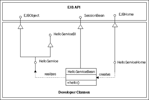 We need to abstract out the interface from all EJB specific details; hence, we have followed the BI pattern to define the interface. HelloServiceBI is the BI, which is void of any EJB specific API.