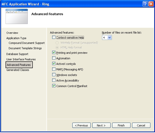 Let us start by selecting New Project in the File menu and choosing Visual C++ Projects and MFC Application with the name Ring and a suitable place on the hard drive.