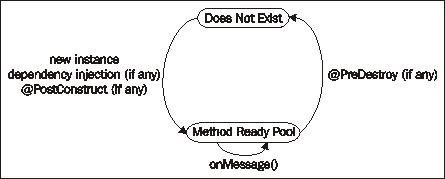 There are just two MDB lifecycle states: does-not-exist and method-ready pool. The initial state of an MDB is the does-not-exist state. This would be the case before a container starts up. The next state is the method-ready pool. When the container starts up it typically creates a number of MDB instances in the method-ready pool. However, the container can decide at any time to create such instances. In creating an instance in the method-ready pool, the container performs the following steps:
