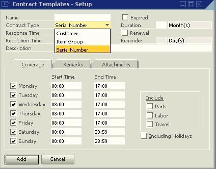 In the admin section, we can define the service contract templates that can later be used as a basis for actual contracts. Please note the template character. All of the parameters we define here will automatically populate the relevant details in the contract once a template is selected. The following screenshot shows that a contract template can be created not only on a per-customer basis, but also for item groups, and a specific item based on serial numbers. In addition, please note the Reminder setting. You can set a reminder which will provide an alert prior to the expiry of the contract. This way, you can be sure that you contact all customers and allow them to renew their contracts.