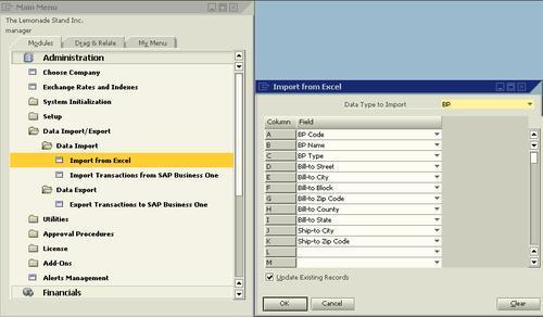 You can reach the Import from Excel form via Administration | Data Import/Export. As you can see in the following screenshot on the right top section of the form, the type of import is a drop-down selection. The options are BP and Items. In the screenshot, we have selected BP, which allows business partner information to be imported. There are drop-down fields that you can select based on the data you want to import. However, keep in mind that certain fields are mandatory, such as the BP Code field, whereas others are optional. The fields you select are associated with a column as you can see here: