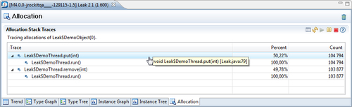 As can be readily seen from the screenshot, we are invoking put more often than remove. If we are running Memleak from inside Eclipse, we can jump directly to the corresponding line in the Leak class by right clicking on the stack frame and then clicking on Open Method from the context menu.