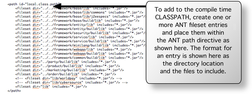 The Java compiler uses information on the CLASSPATH to resolve references to Java classes that are present within your OFBiz program. Since there may be many class references within your Java code, OFBiz makes it easy to add classes and JAR files to the compile time CLASSPATH by providing the ANT tool.