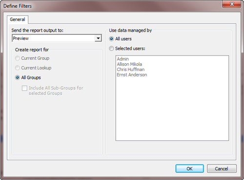 The main difference in the General tab filtering for the groups reports is in the Create report for. Where the contact reports always allowed you to select any of the three options: Current Contact, Current Lookup, or All Contacts, with the group reports the only option that will be active is the All Groups option, unless you created a lookup of some specific groups prior...