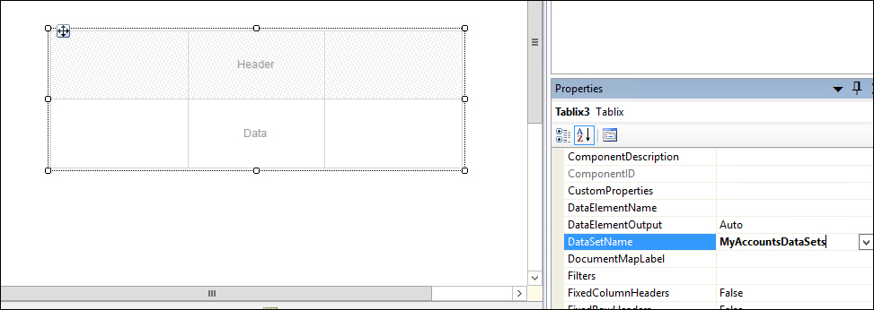 To start using a data set we can add a Table control to our report and select the data set we created in the DataSetName property of the Table control as follows: