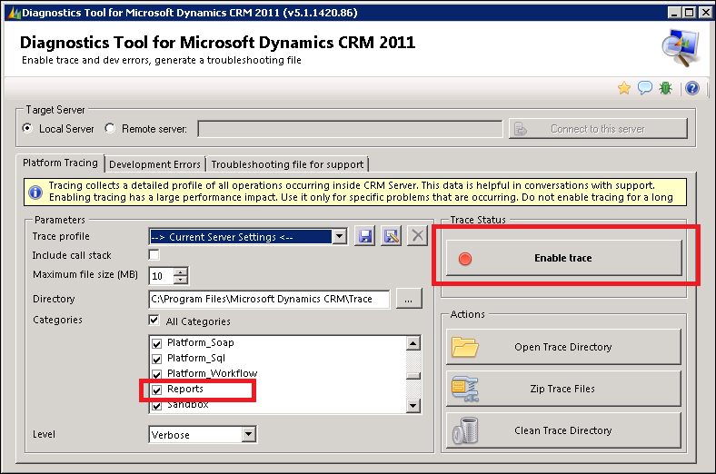 CRM Trace can be enabled by touching some registry keys on the server as explained in this KB (http://support.microsoft.com/kb/907490). However, the safest and easiest way to enable the trace is by using Diagnostics Tool for Microsoft Dynamics CRM 2011 that my fellow Microsoft MVP, Tanguy Touzard created and published on CodePlex. This tool can be downloaded from http://crmdiagtool2011.codeplex.com/, and when we run it, we will see a window similar to the following screenshot: