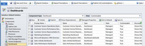 This will launch the solution editor dialog showing the Default Solution for Dynamics CRM 2011. Click on the Dashboards link located in the left-hand side navigation section, as shown in the following screenshot: