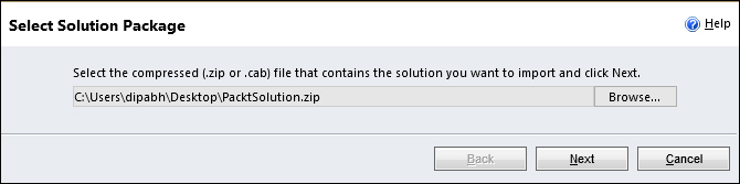 The Import Solution web dialog will pop up. On the Select Solution Package page, click on the Browse button to browse the solution file from the disk. Then click on Next to proceed: