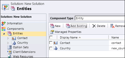 Select Entities, and click on Add Existing to add the Contact entity, as shown in the following screenshot: