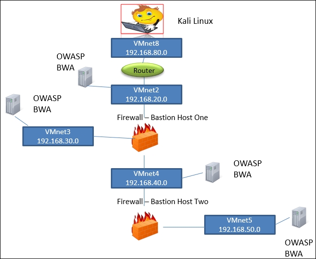 The previous diagram shows our entire external architecture, and the first thing that we encounter is the router; therefore, it is the first device we will use to perform our testing against.