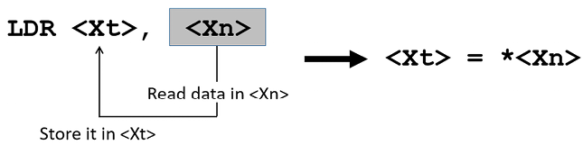 Here, <Xn> is the base register, which holds the memory address to access, while <Xt> is the destination register. In other words, we can say that it reads the data from <Xt> and stores it in <Xn>. When running the LDR instruction illustrated in Figure 4.1, it performs the following actions simultaneously: