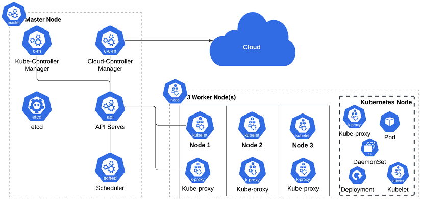 In the preceding diagram, the Kubernetes architecture has the control plane (master node) positioned on the left. In the center, there are three worker nodes, each containing its respective kubelet and kube-proxy agent. At the top right, a detailed view of a worker node highlights the interactions between various components within the cluster. Notice the interaction between the different components of the cluster.