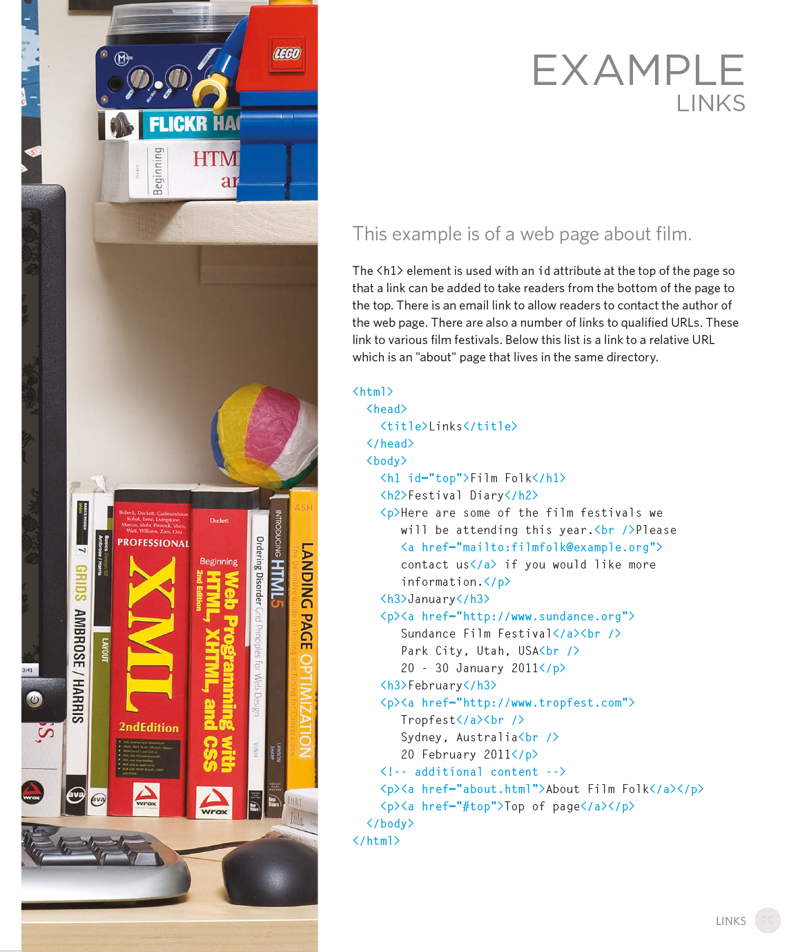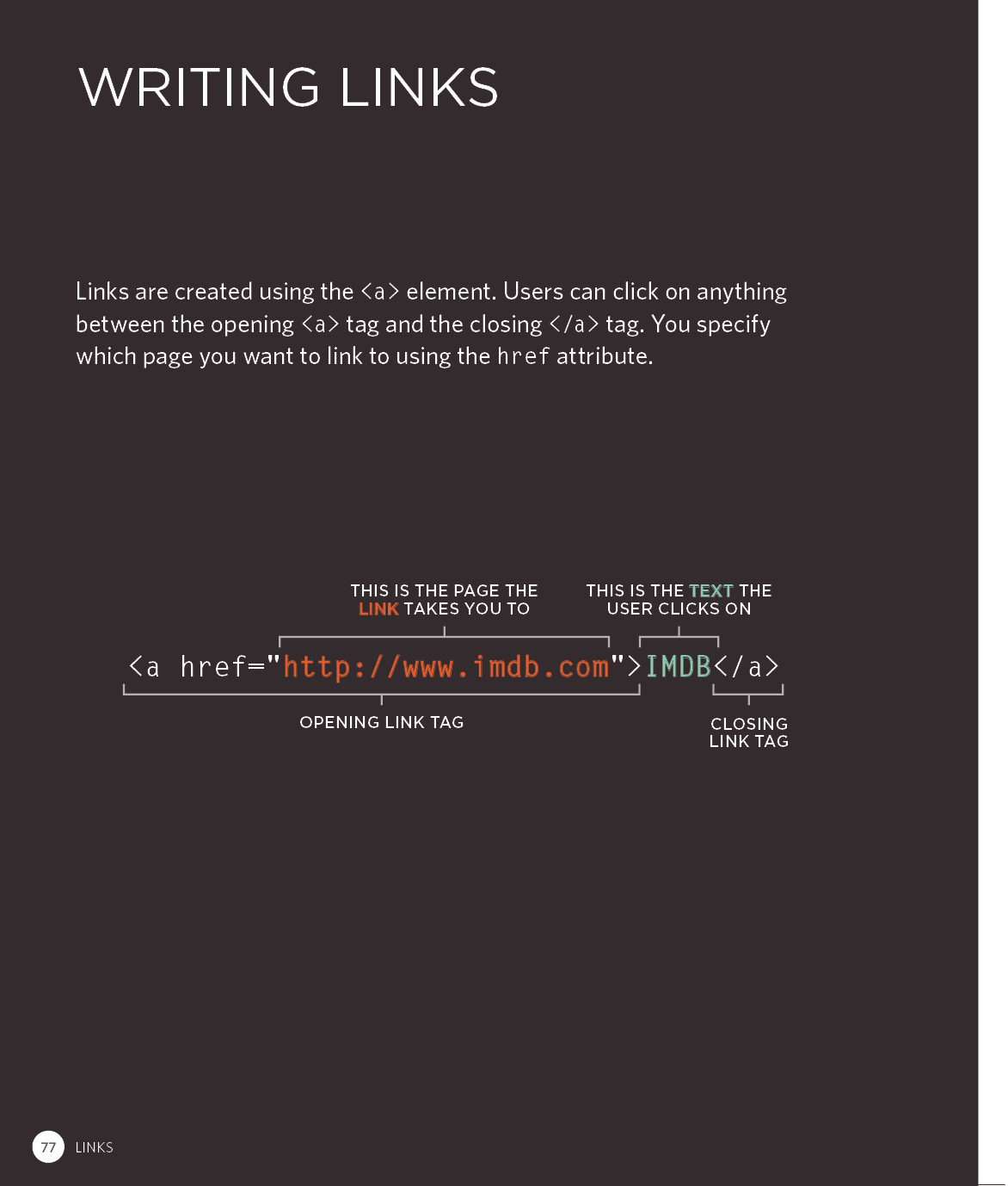 Every day, more and more people want to learn some HTML and CSS. Joining the professional web designers and programmers are new audiences who need to know a little bit of code at work (update a content management system or e-commerce store) and those who want to make their personal blogs more attractive. Many books teaching HTML and CSS are dry and only written for those who want to become programmers, which is why this book takes an entirely new approach. This educational book is one that you will enjoy picking up, reading, then referring to. It will make you wish other technical topics were presented in such a simple, attractive and engaging way!