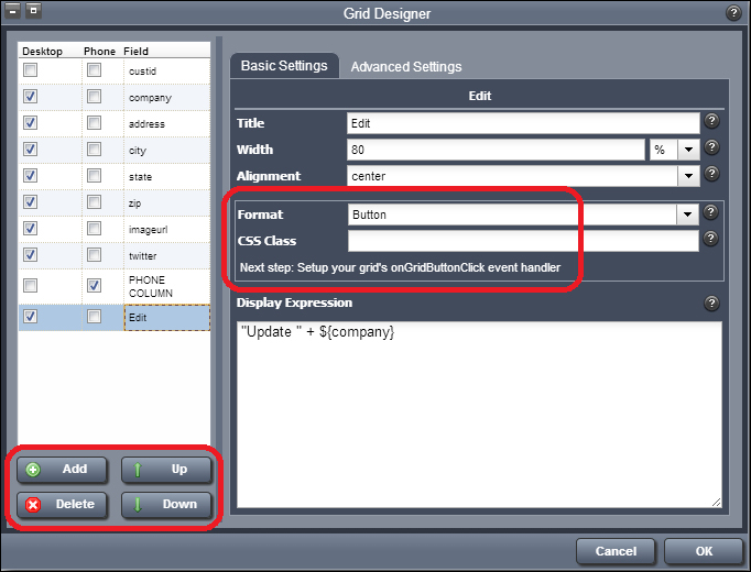 With the custom column added to the layout, we use the right-hand side section of the dialog to set the column properties. In the preceding screenshot, we have added a button column by choosing Button for Format. We have set a display expression that will be the button's label. It simply prepends "Update " to the company name, being certain to leave a space to go before the company name value for the row. This dialog does not handle events, so it reminds us that the button action must be configured using the grid's