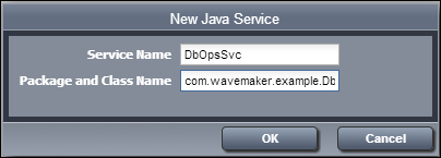 In the previous example, the service name is DbOpsSvc, as in "database operations service". The fully qualified class name entered into the Package and Class Name editor is com.wavemaker.example.DbOpsSvc. This creates a class named DbOpsSvc in the com.wavemaker.example package. The class name and the service name do not need to match. However, using the same name for both, or at least a similar name, makes it easier to remember which class is associated with which service.
