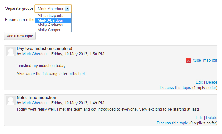By default you will see all forum entries, but if you select the Separate Groups drop-down menu at the top of the page, you will be able to see all of the groups in the course. Remember that each group is an individual apprentice.