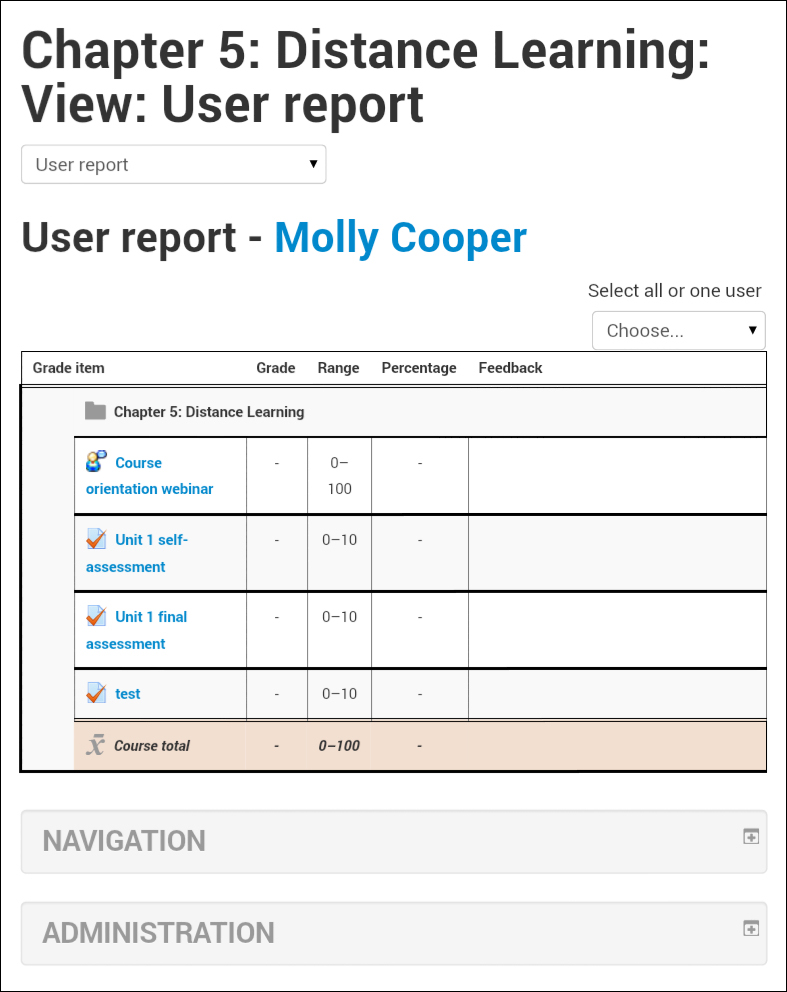 Navigate to Site administration | Grades | Report settings to select the columns to display for each report, in order to optimize the report for mobile delivery. You should aim to reduce the columns shown to the minimum required by your students. For example, under User report, you can select from the following columns: