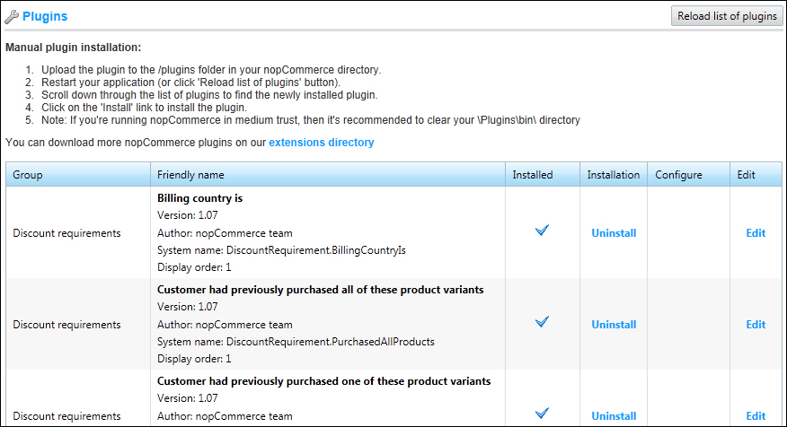 The base installation of nopCommerce comes with a wide range of plugins that are ready to use. These include payment methods such as PayPal and Google Checkout, as well as shipping methods such as FedEx and UPS. To view all the plugins that are currently installed, navigate to Configuration | Plugins: