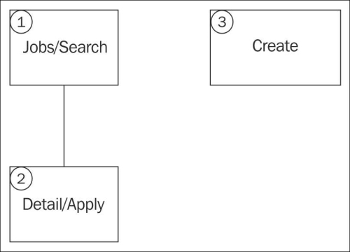 Jobs/Search: Imagine this as the start point. The user is presented with a list of active jobs available on the site. The user is able to view the job details and apply (taking them to point 2 of the site map), or click on Create on the navigation...