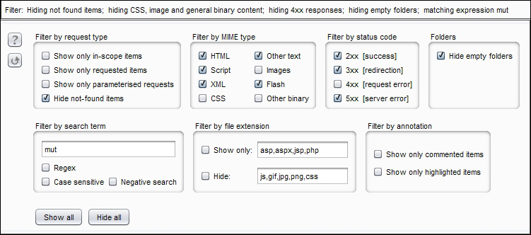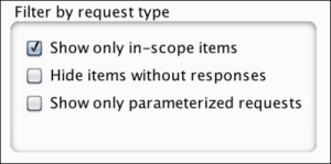 Request type to show only in-scope requests, show only parameterized requests, and even hide items not found, as shown in the following screenshot: