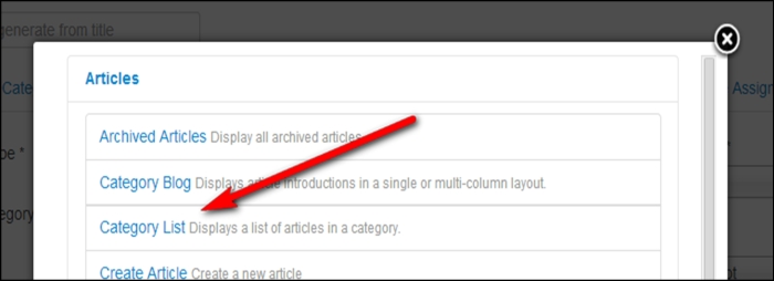 In the Details screen, click on the Select button next to the Menu Item Type option. In the Select a Menu Item Type pop-up screen, click on Category List, as shown in the following screenshot: