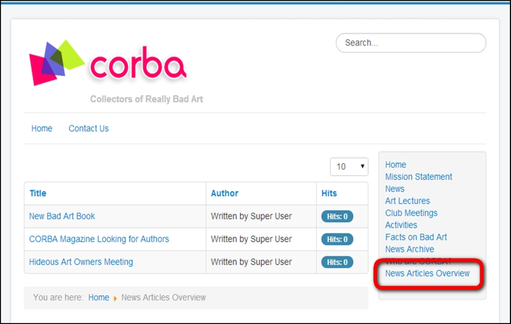 Click on Save. Done! Click on View Site to see the home page of your site, and click on the News Articles Overview link to see the new list page. It should look similar to the following screenshot: