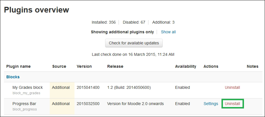 Go to Administration block by navigating to Site administration | Plugins | Plugins overview, which brings up the Plugins overview page.