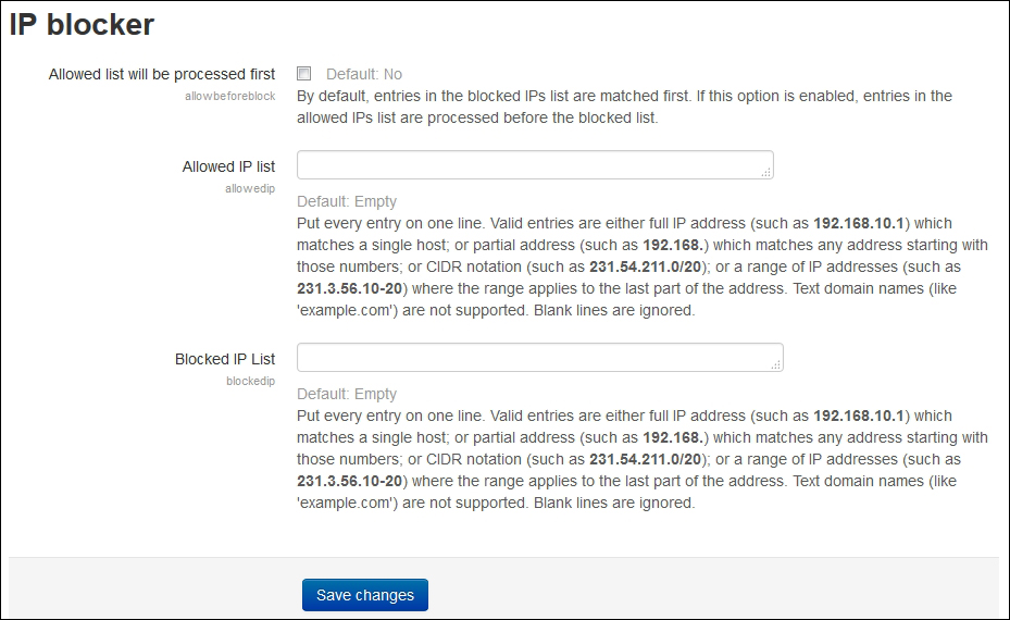 The IP Blocker page allows you to configure an Allowed IP list, a Blocked IP list, and tells you which list to process first. This is useful if you want to limit your Moodle site access to block access from IPs, which are sending you disruptive traffic.