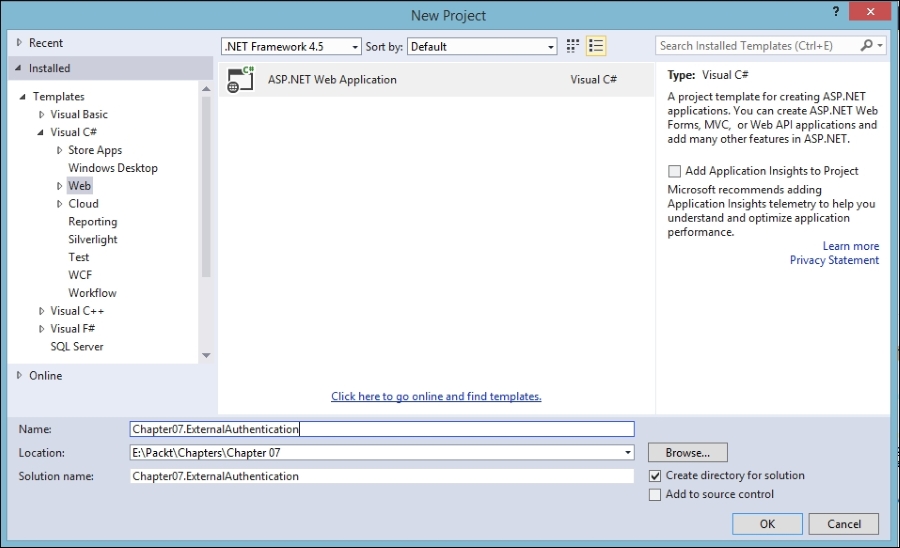Name the project as Chapter07.ExternalAuthentication and click OK: