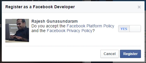 Select Yes to accept the Facebook Platform Policy and Facebook Privacy Policy and click Register, which would successfully register you as a Facebook Developer. You can now add Facebook to your app or website: