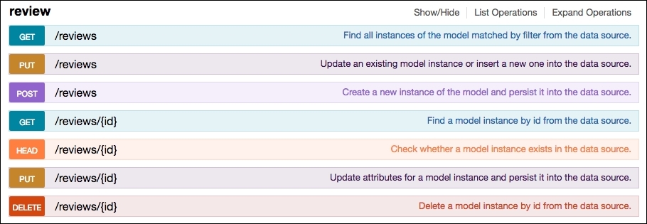 When we click on the review model we can see all the endpoints with the HTTP verb, as we can see in the following image: