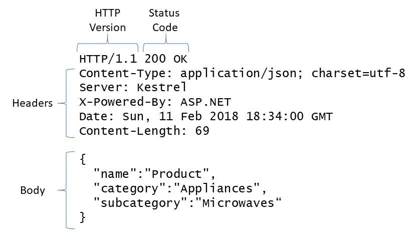 As you can see, the HTTP response includes Status Code, Headers, and Body. Each of these parts allows you to communicate pieces of information to the client, and ASP.NET Core provides the glue that converts the results of your action methods into those parts of the HTTP response, regardless of whether they are executed successfully, or completed with a failure.
