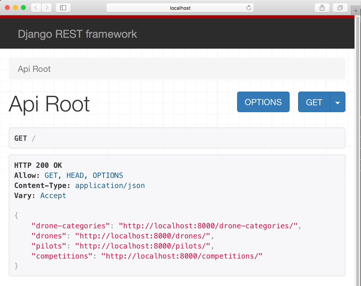 We will take advantage of the browsable API feature that we introduced in Chapter 5, Understanding and Customizing the Browsable API Feature, with our new web service. Let's start browsing our new RESTful Web Service. Open a web browser and enter http://localhost:8000. The browser will compose and send a GET request to / with text/html as the desired content type, and the returned HTML web page will be rendered.